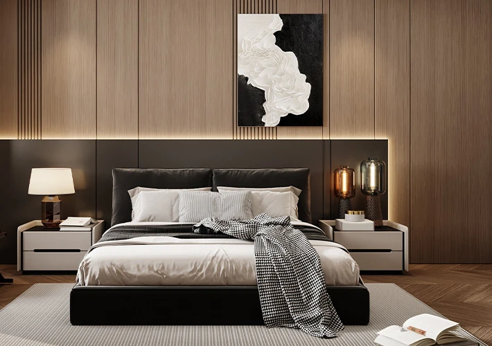 Walnut tones symbolize warmth, stability, and premium quality in hospitality design. When combined with bamboo charcoal composite technology, the result is a material that not only looks like high-end natural wood but also delivers advanced performance benefits such as moisture control, air purification, and fire resistance.