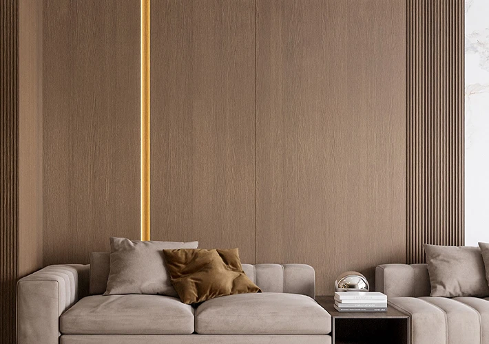 Walnut texture creates premium ambience in hotel lobbies, guest rooms, and executive lounges. Bamboo charcoal veneer replicates natural wood aesthetics while maintaining dimensional stability and consistency across large surfaces.