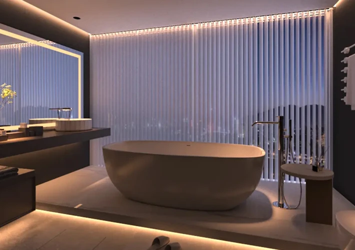 - Ambient: Ceiling-mounted or cove lights for general illumination.
